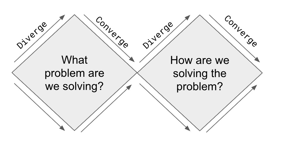 Before converging on a solution you have to explore the problem by actively seeking perspectives that don’t match, pressure-testing hypotheses, and treating disagreement as information. Only after you’ve converged on what the problem actually is do you diverge again on possible solutions. Two expansions, two contractions.